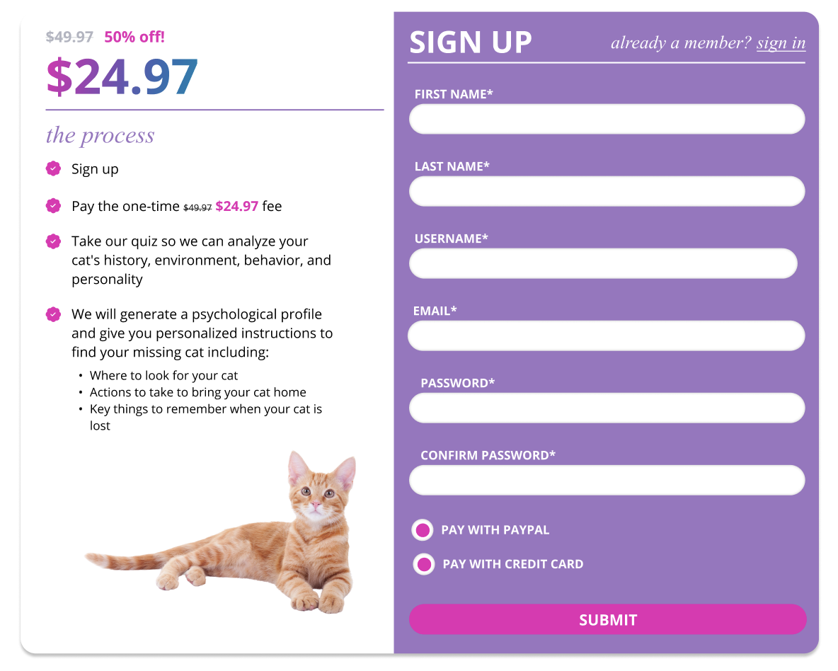 Finally, on the registration page we included a step-by-step of the purchase and application’s process for users who hadn’t visited the lost cat help page, as well as web application FAQs and links to CatProfiler’s success stories page to ease common lingering concerns users may have before making their final purchase.